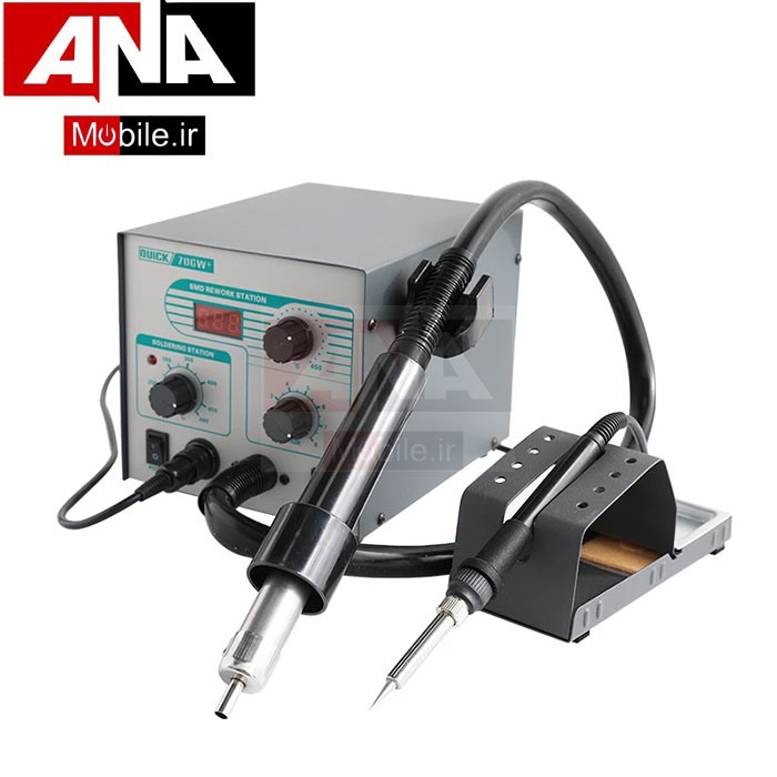 هویه هوای گرم کوییک Quick 706W Plus یکی از پرکاربردترین ابزار و تجهیزات برای تعمیرکاران (موبایل و لب تاپ و pc و...) و طراحان بردهای الکترونیکی به ویژه بردهای دارای قطعات SMD می باشد.در این دستگاه یک نمایشگر وجود دارد که دمای هیتر را نشان می دهد .این دستگاه دارای یک هویه با قابلیت تنظیم دما از 200 تا 480 درجه سانتی گراد و یک هیتر دیجیتال با قابلیت تنظیم دما از 100 تا 450 درجه سانتی گراد و همچنین تنظیم فشار باد خروجی است. توان این دستگاه 580W می باشد که قدرت خوبی برای آن به حساب می آید. اقلام همراه این دستگاه سه عدد نازل هواگرم ، پایه هویه و بغل بند هواگرم برای قسمت هیتر آن است