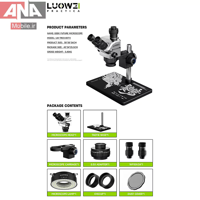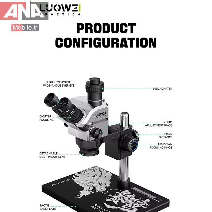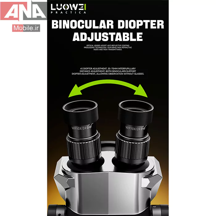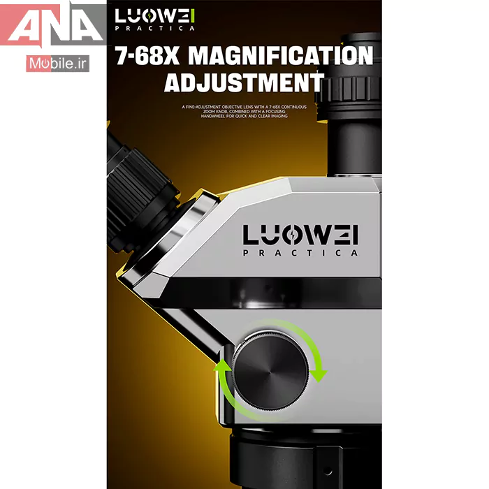 لوپ سهچشم LUOWEI TR03‑B3TV یکی از حرفهایترین میکروسکوپهای تعمیراتی برند لووی است که برای تعمیرات تخصصی موبایل، بردهای SMD، CPU، IC و BGA طراحی شده است. این مدل دارای بزرگنمایی متغیر 7X تا 50X بوده و با استفاده از لنز کمکی، بزرگنمایی آن تا حدود 68X افزایش مییابد.