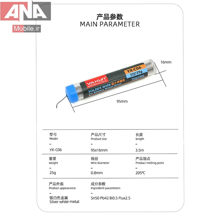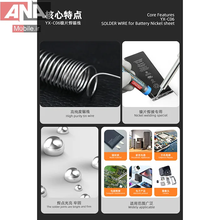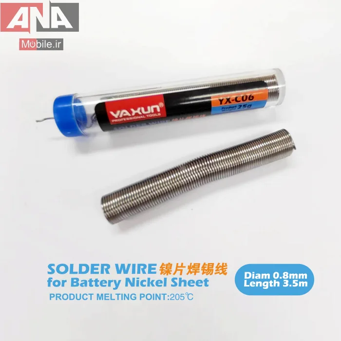 این محصول همان سیم نیکل باکیفیت یاکسون مدل YX‑C06 است که بیشتر برای لحیمکاری و اتصال پلیتهای باتری، تب باتری لیتیومی و همچنین جداسازی آیسی استفاده میشود و در بازار با نامهای «سیم لحیم باتری نیکل» یا «سیم نیکل باتری» شناخته میشود.