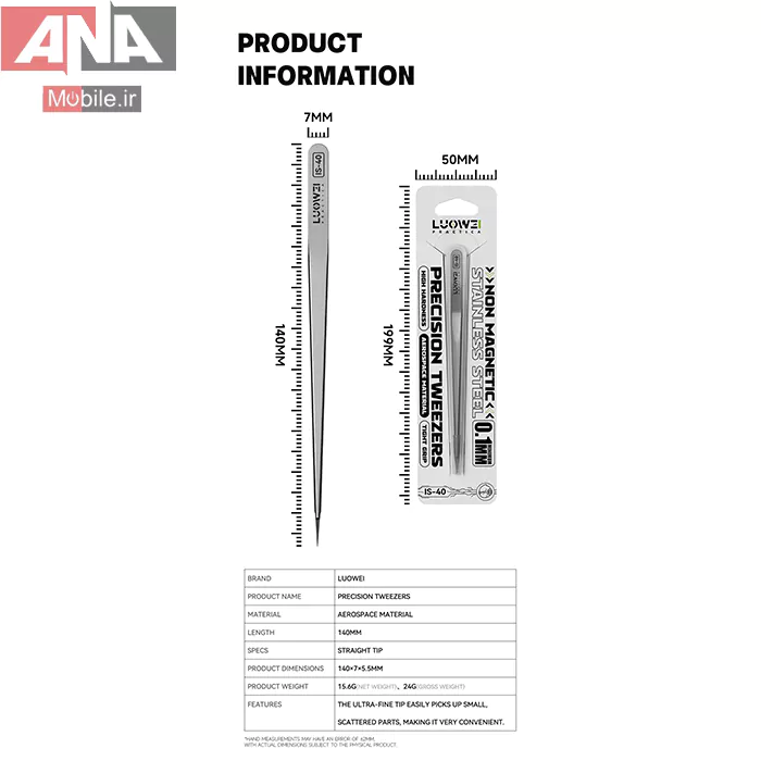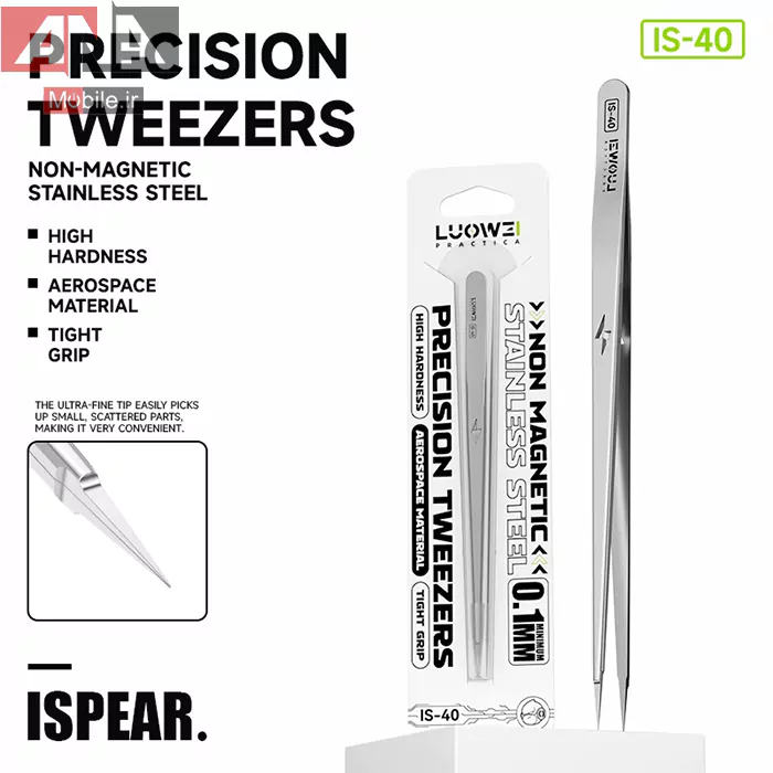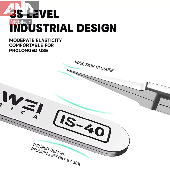پنس IS‑40 یک ابزار حرفهای با نوک فوقظریف است که برای کارهای بسیار دقیق طراحی شده؛ انتخابی ایدهآل برای تعمیرات موبایل، الکترونیک، بردهای SMD، جواهرسازی و کارهای میکروسکوپی.