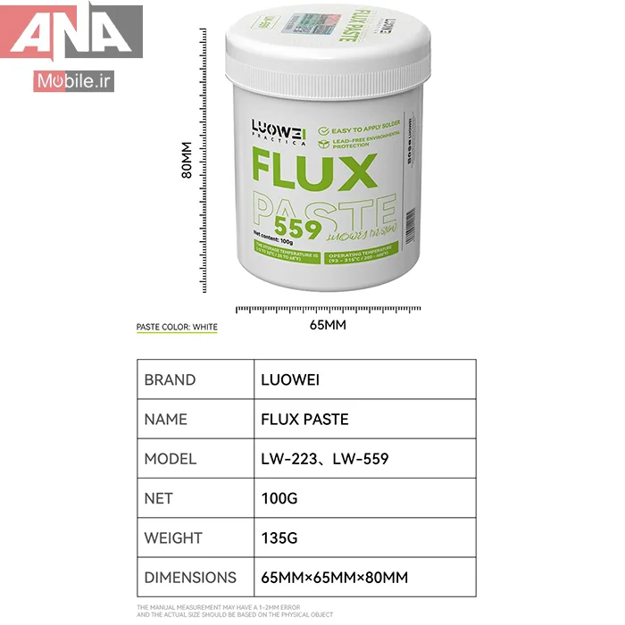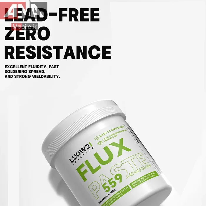 فلکس LUOWEI LW‑559 دارای قابلیت تمیزکاری عالی بوده و باقیمانده خورنده روی برد به جا نمیگذارد. رنگ سفید خمیر و ترکیبات پایدار آن باعث میشود در دمای کاری بالا، عملکرد یکنواخت و بدون افت کیفیت داشته باشد.