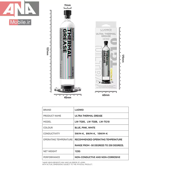 خمیر سیلیکون LUOWEI LW-TG10 یک خمیر حرارتی حرفهای با رسانایی حرارتی 10 وات بر متر-کلوین (10W/m·K) است که برای انتقال سریع و مؤثر حرارت میان پردازنده و هیتسینک یا سیستمهای خنککننده طراحی شده است. این خمیر با بهرهگیری از ذرات نانومتری رسانای حرارتی، عملکردی بسیار پایدار و یکنواخت در دفع حرارت ارائه میدهد و موجب کاهش دمای CPU، GPU و چیپهای الکترونیکی میشود.