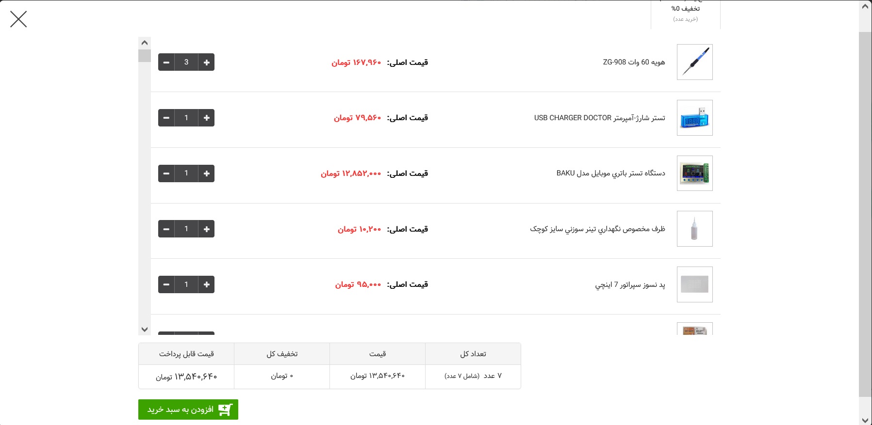 بعد تمامی لیست محصولات ابزار به صورت لیست کامل برای شما نشان داده میشود که فقط کافیه تعداد محصولات و در آخر گزینه افزودن به سبد خرید رو بزنید.